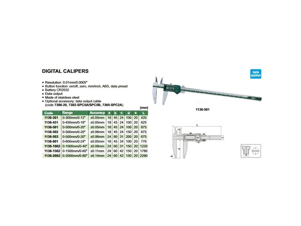 Șubler digital cu ciocuri teșite, cu interval 0-500 mm și rezoluție 0,01 mm de la INSIZE. Lungimea ciocurilor inferioare este de 150 mm, cu port ieșire date.