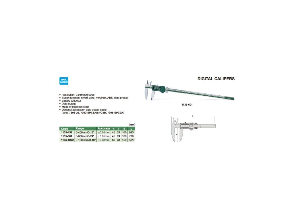 Șubler digital de la INSIZE cu ciocuri inferioare retezate și cu ciocuri superioare spre interior, cu interval 0-600 mm și rezoluție 0,01 mm. Lungimea ciocurilor inferioare este de 100 mm, cu port ieșire date.