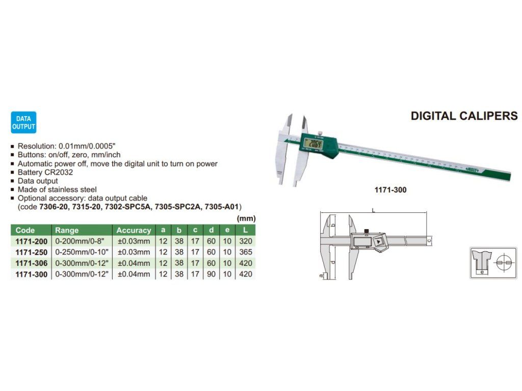 Șubler digital lung cu interval 0-200 mm și rezoluție 0,01 mm de la INSIZE. Lungimea ciocurilor inferioare este de 60 mm, cu vârfuri teșite de 12 mm. Cu port ieșire date.