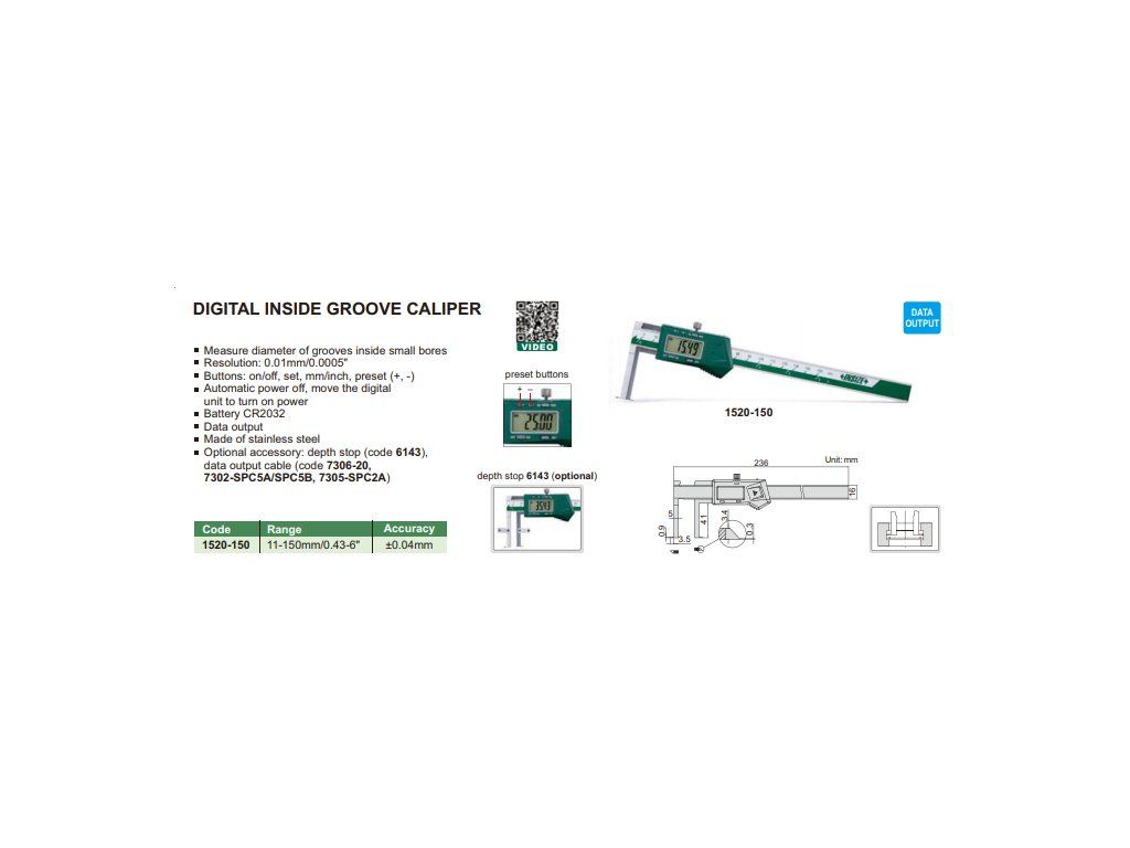 Șubler digital cu interval 11-150/0,01 mm, tip A de la INSIZE cu ciocuri inferioare cu dimensiuni 41/3,5 mm pentru măsurarea dimensiunilor de mici caneluri și orificii, cu port ieșire date.