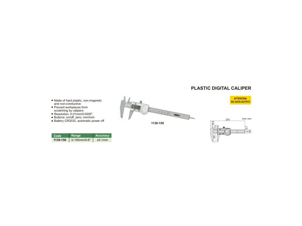 Șubler digital din plastic întărit, cu interval de măsurare 0-150 mm și rezoluție 0,01 mm. Lungimea ciocurilor inferioare este de 40 mm, cu tijă plată pentru măsurarea adâncimilor. Ideal pentru măsurarea componentelor și pieselor care nu trebuie să intre în contact cu metalul.