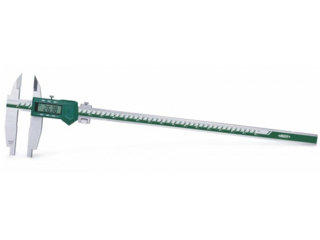 Șubler digital lung cu interval 0-1000 mm și rezoluție 0,01 mm de la INSIZE. Lungimea ciocurilor inferioare este de 150 mm, cu vârfuri teșite de 24 mm. Cu port ieșire date.