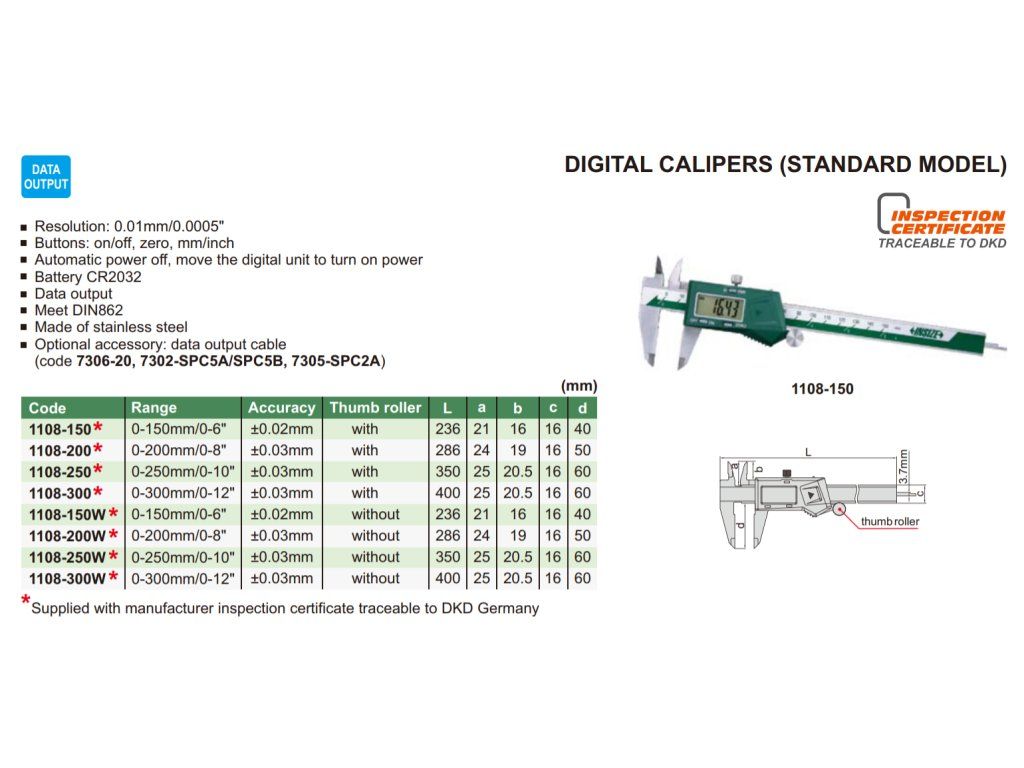 Șublerul standard digital de la Insize, cu interval de măsurare 0-300 mm și rezoluție 0,01 mm. Lungimea ciocurilor inferioare este de 60 mm, cu port ieșire date, rolă de avans și tijă plată pentru măsurarea adâncimilor.