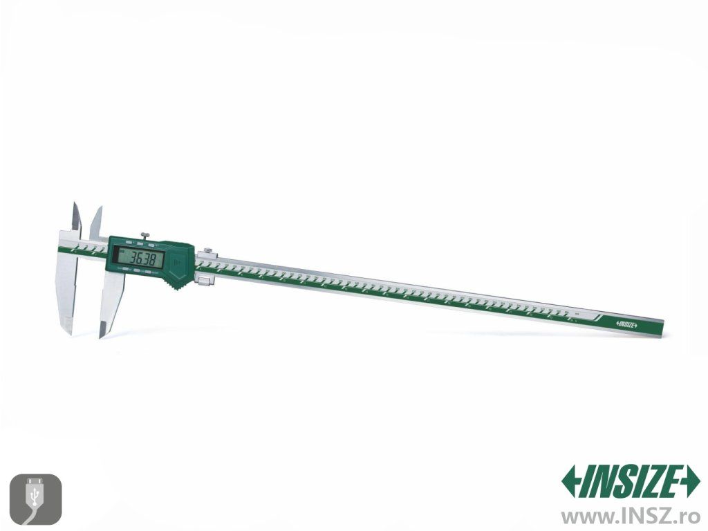 Șubler digital de la INSIZE cu ciocuri inferioare retezate și cu ciocuri superioare spre interior, cu interval 0-600 mm și rezoluție 0,01 mm. Lungimea ciocurilor inferioare este de 100 mm.