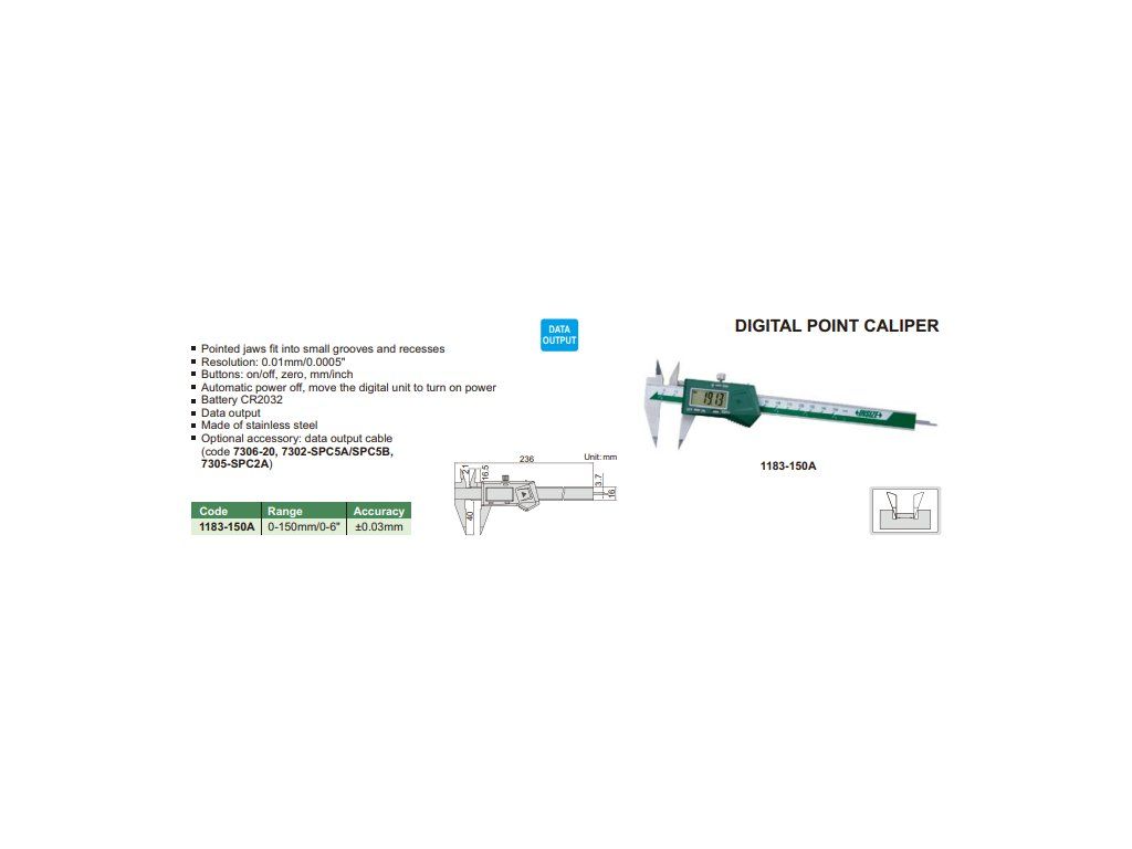Șubler digital cu interval 0-200/0,01 mm de la INSIZE cu ciocuri inferioare ascuțite cu lungime de 50 mm, pentru măsurarea dimensiunilor canelurilor mici, cu port ieșire date și tijă de adâncime.