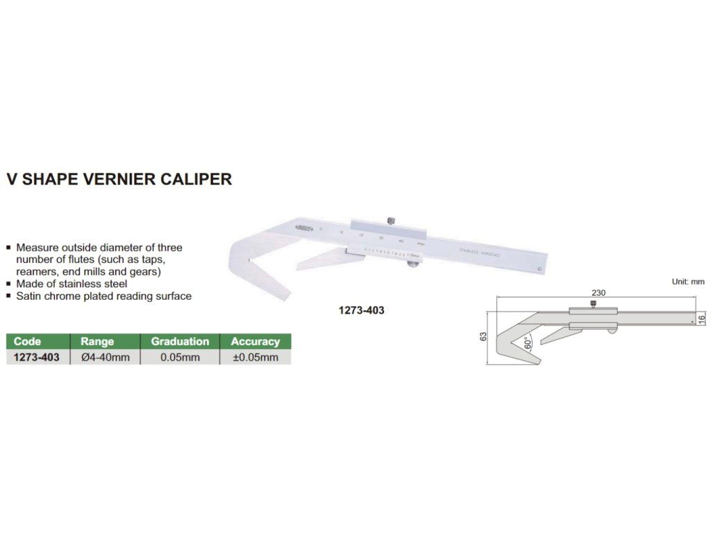 Șubler mecanic în formă de V de la INSIZE. Interval ø 4-40 mm, rezoluție 0,05 mm și precizie ± 0,05 mm.