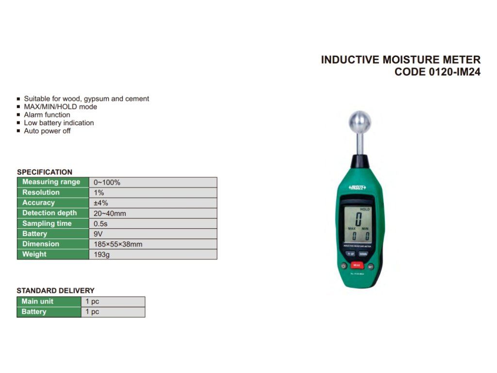 Higrometru digital cu interval de măsurare 0-100% de la INSIZE. Potrivit pentru lemn, gips și ciment.