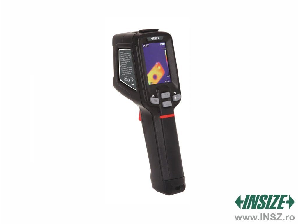 Termocameră de la INSIZE cu indicator laser pentru poziționare, buton de declanșare pentru realizare de fotografii. Cu interval de temperatură -20 ~ 150°C, 0 ~ 550°C (comutare automată).